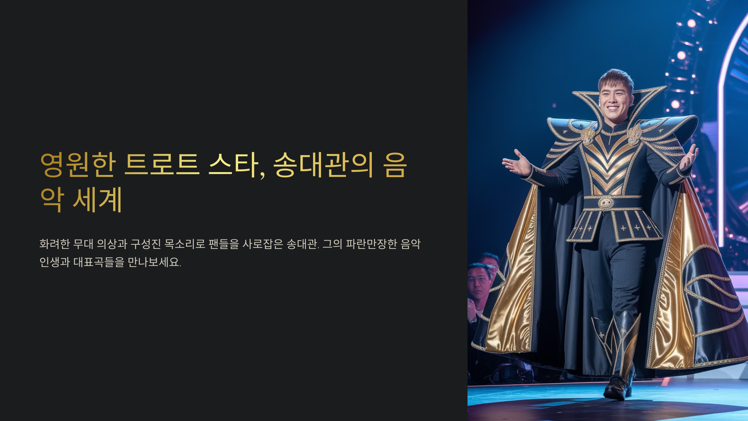 송대관은 한국 트로트의 역사 속에서 빼놓을 수 없는 전설적인 가수예요. 그의 음악은 단순한 노래가 아니라, 사람들에게 위로와 희망을 주는 메시지를 담고 있죠. 앞으로도 그의 노래는 오랫동안 사랑받을 거예요! 🎶