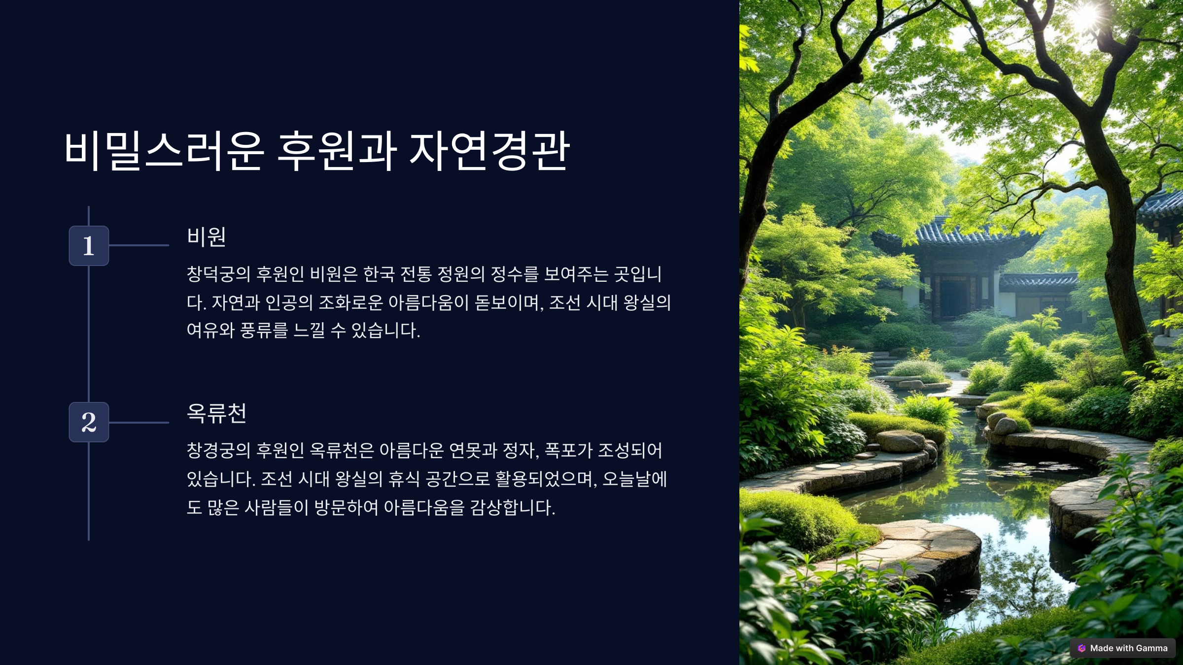 창덕궁과 창경궁은 단순한 건축물이 아니라, 왕과 신하들이 생활하던 역사적인 공간이에요. 다음은 이 궁궐들의 숨겨진 보석 같은 후원을 살펴볼게요! 🌳