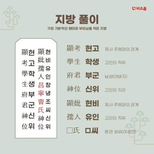 '顯'은 고인의 영혼을 기리는 뜻을 담고 있으며, '考'는 돌아가신 아버지를 의미합니다. '學生府君'은 고인의 사회적 지위를 나타내며, 마지막으로 '神位'는 신위를 뜻합니다. - 어머니 제사: "顯妣孺人○○氏之位"